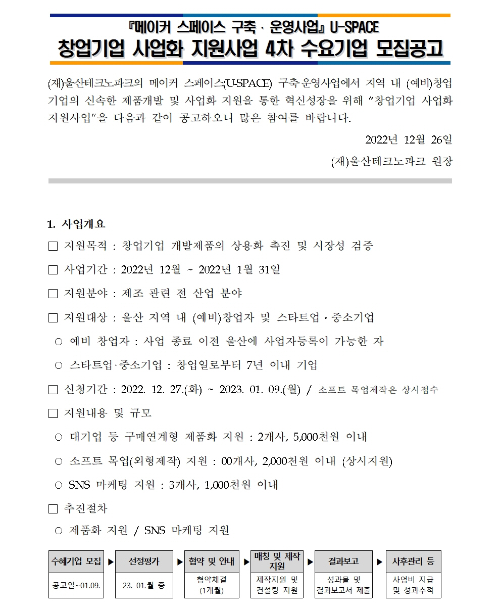 | 제목 | U-SPACE 창업기업 사업화 지원사업 4차 수요기업 모집공고 | ||||