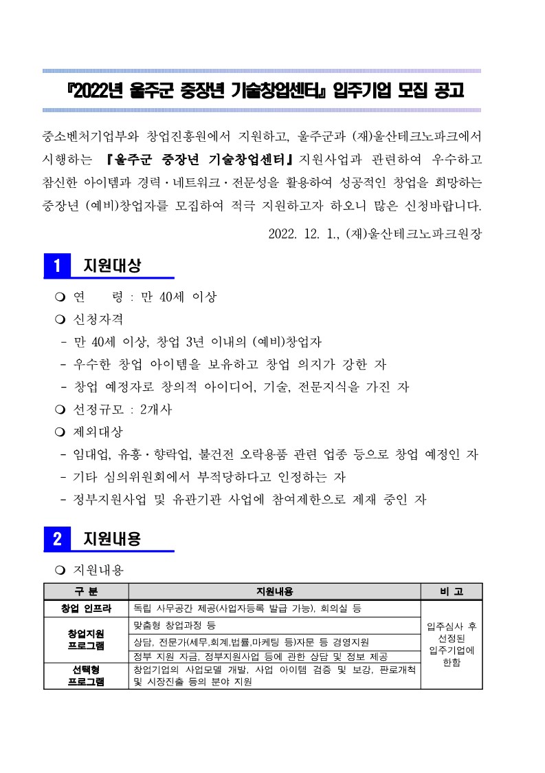 | 제목 | 2022년 울주군 중장년 기술창업센터 입주기업 모집 | ||||
