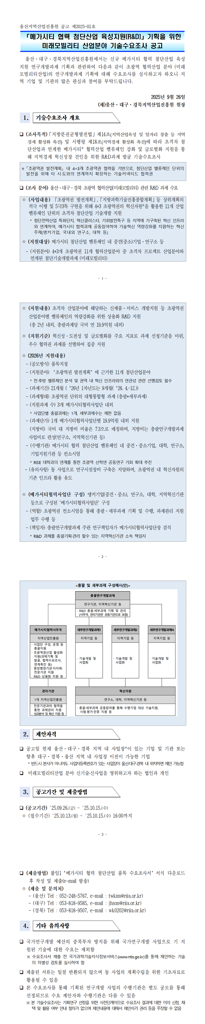 제목 | [울산지역산업진흥원] 2026년 메가시티 협력 첨단산업 육성지원(R&D) 수요조사 공고 | ||||