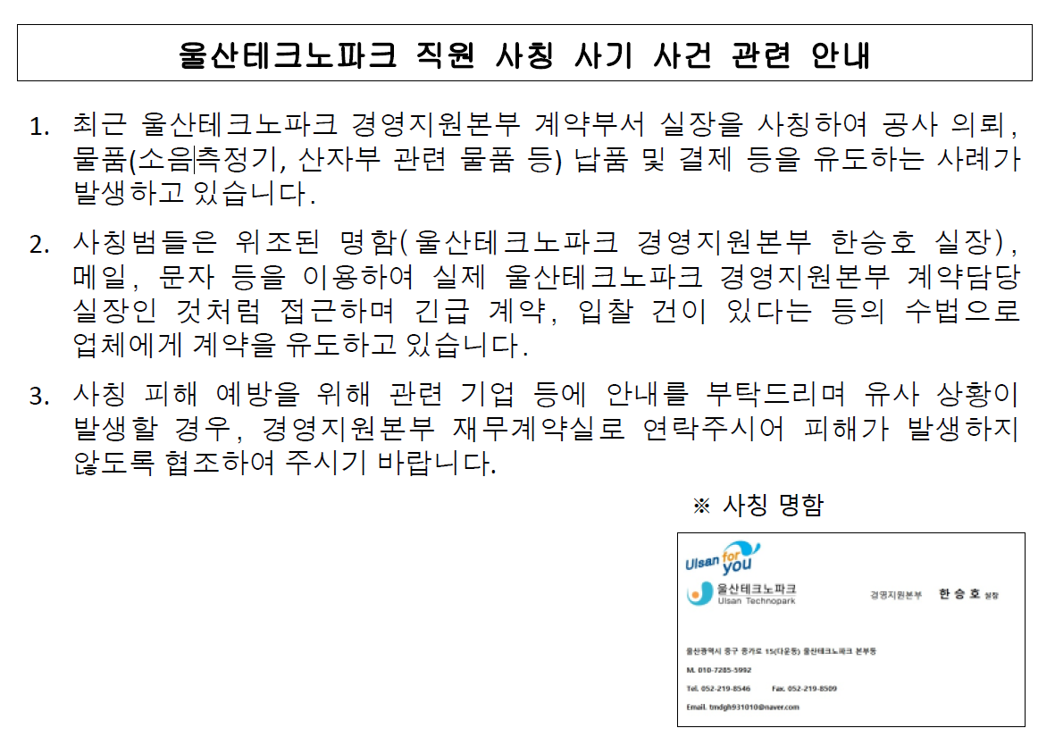 울산테크노파크 직원 사칭 사기 사건 관련 안내
