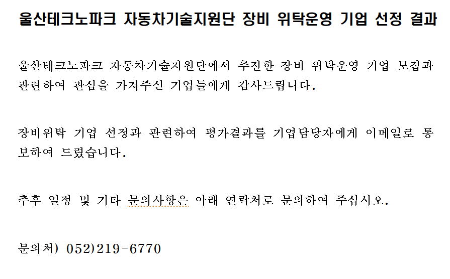 울산테크노파크 자동차기술지원단 장비 위탁운영 기업 선정 결과