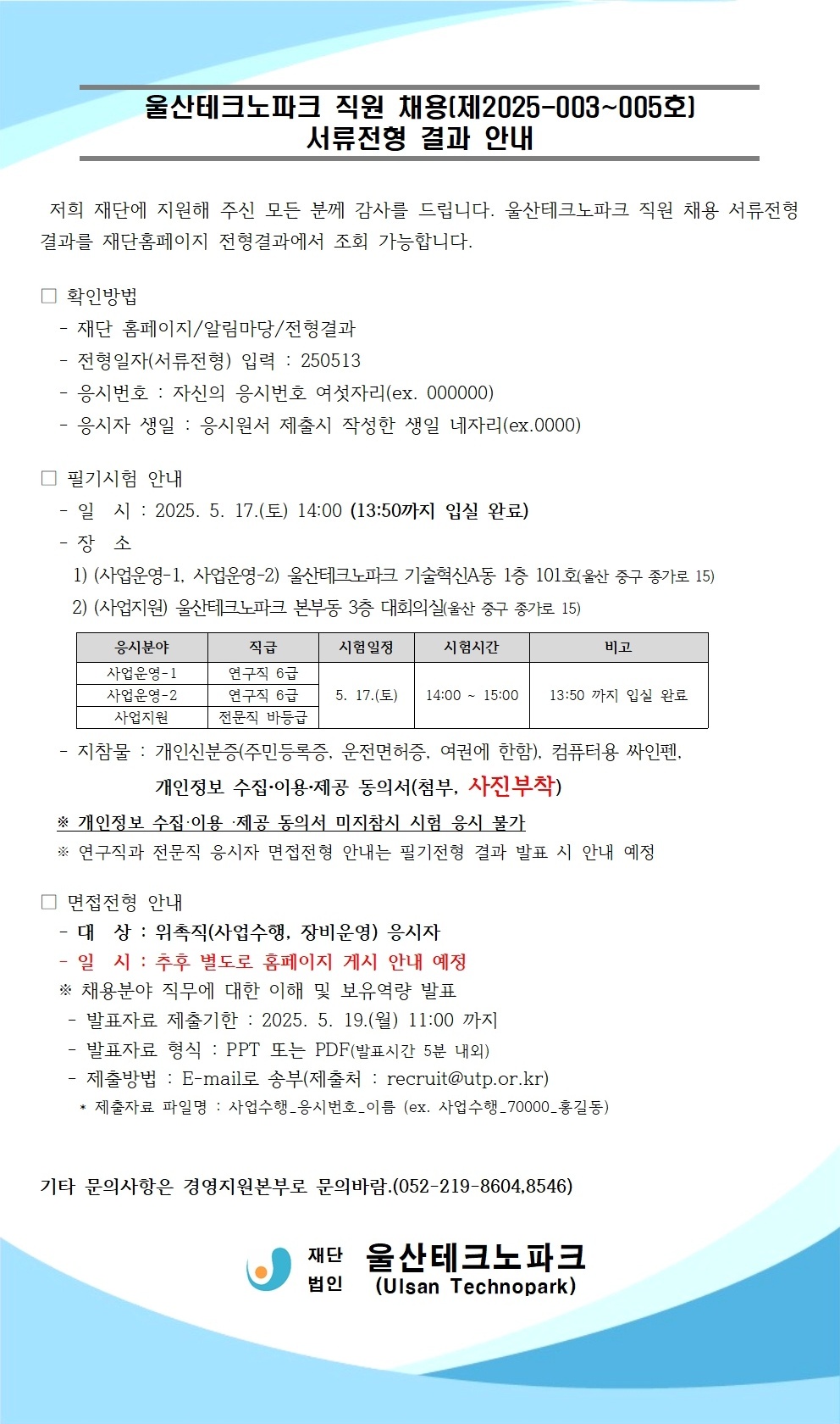 울산테크노파크 직원 채용 서류전형 결과 및 면접전형 안내 (제2025-003~005호)