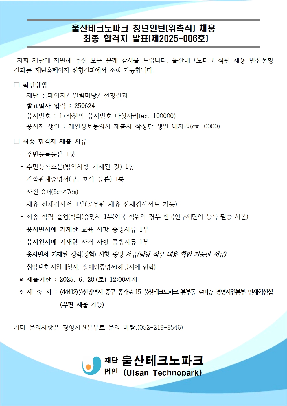 울산테크노파크 청년인턴(위촉직) 채용 최종 합격자 발표(제2025-006호)