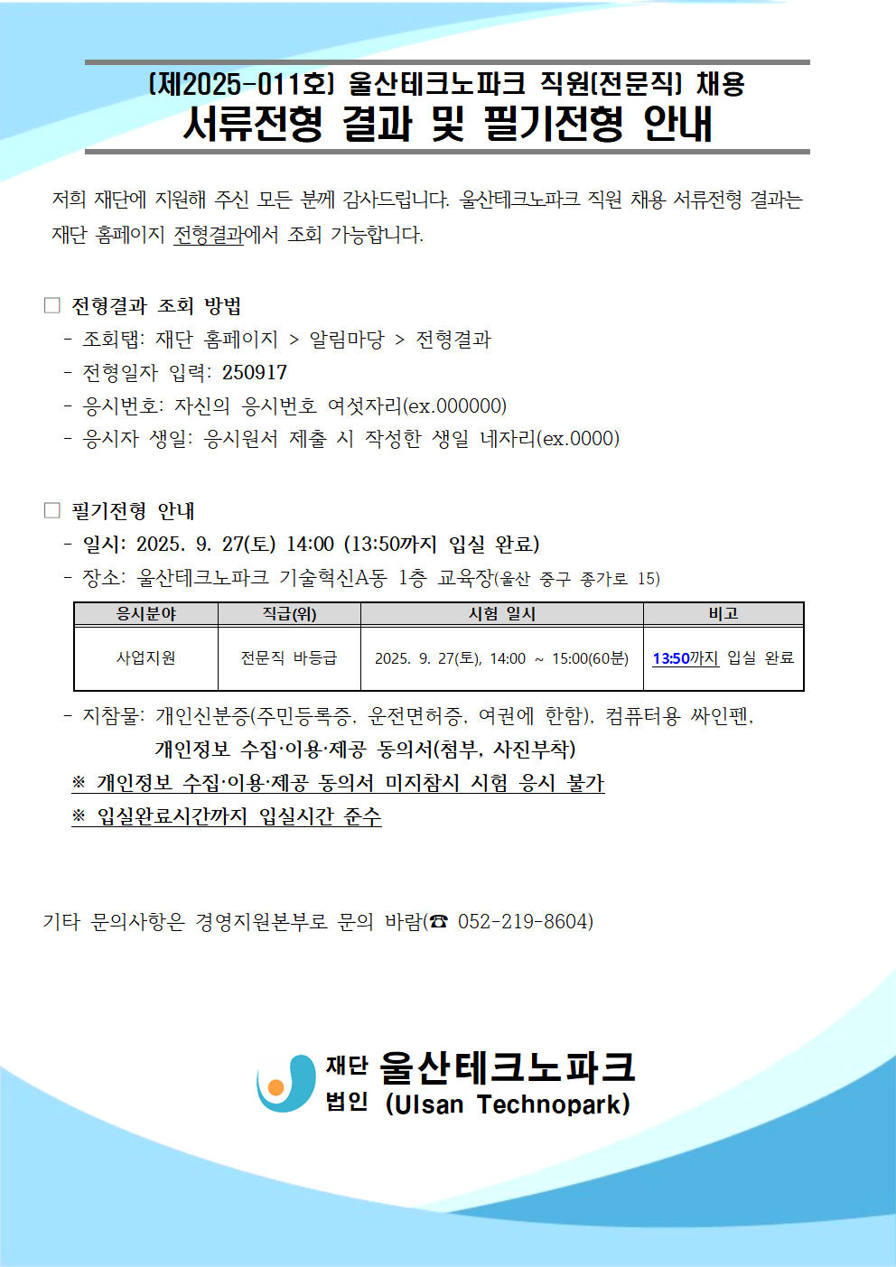 울산테크노파크 직원(전문직) 채용 공고(제2025-011호) 서류전형 결과 및 필기전형 안내